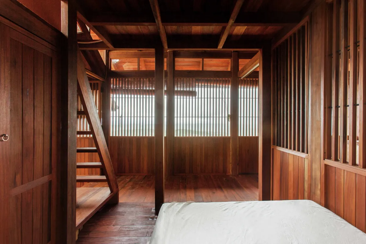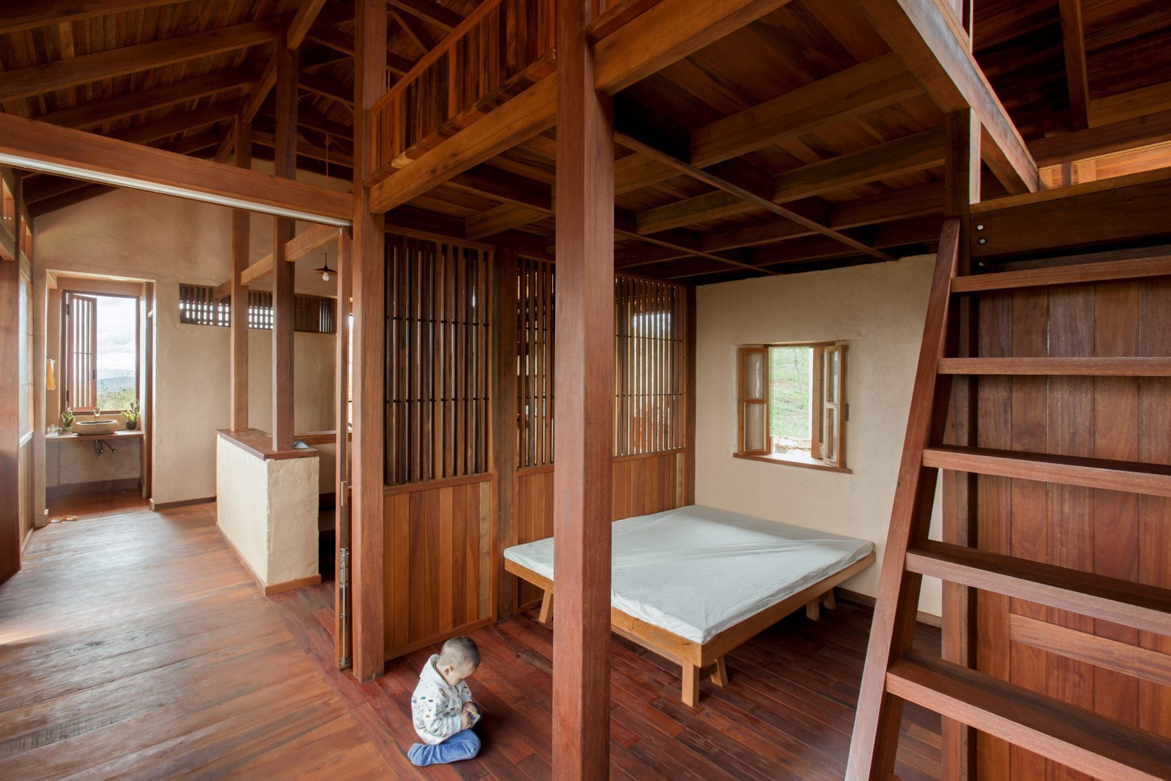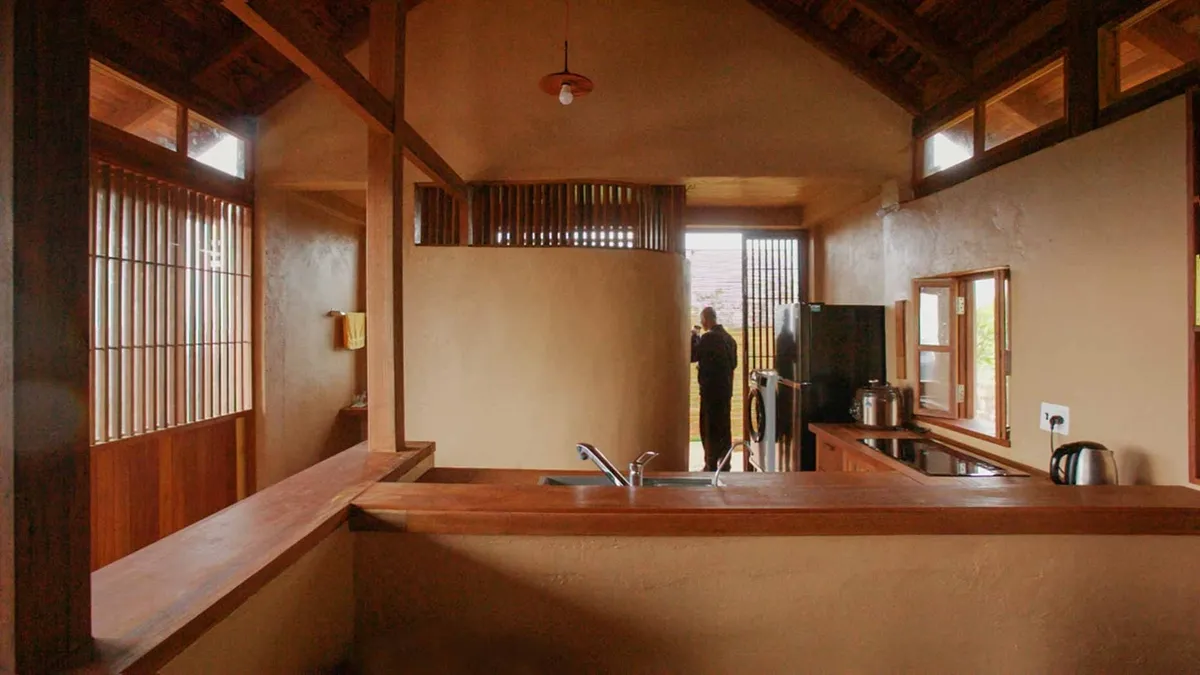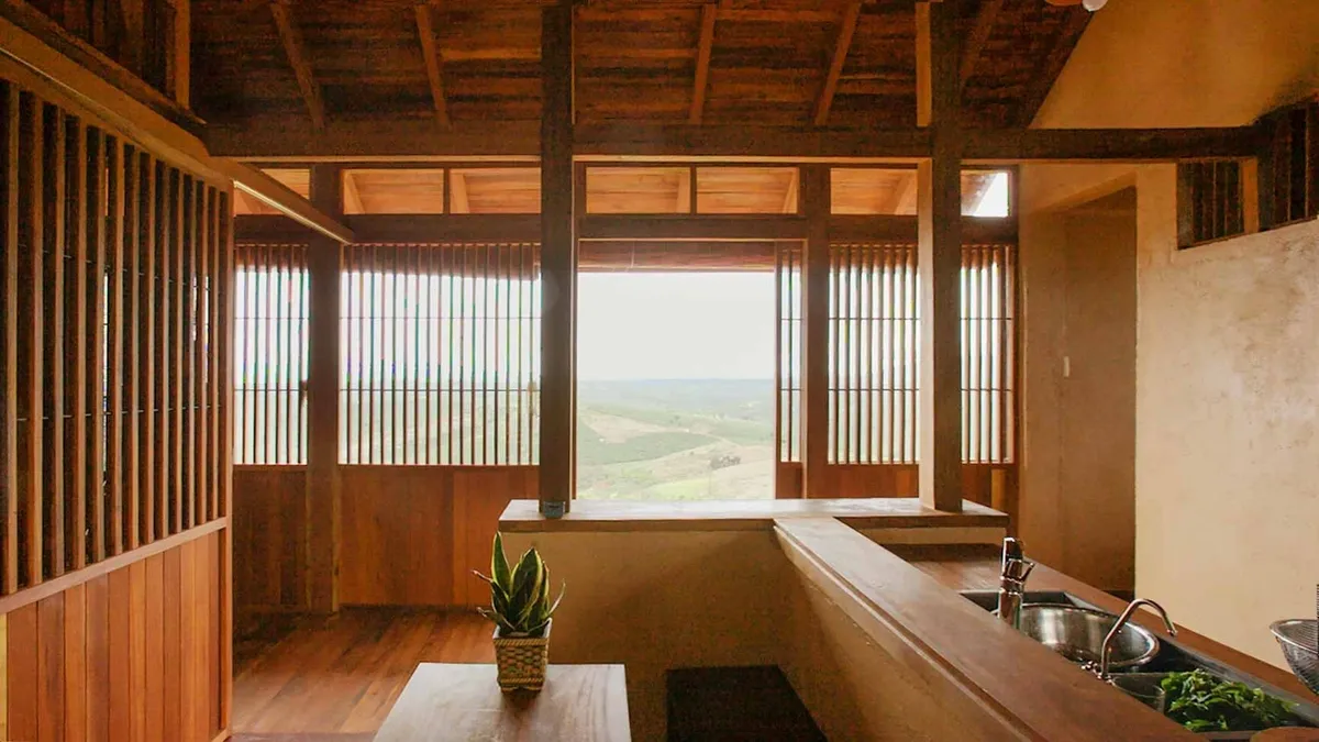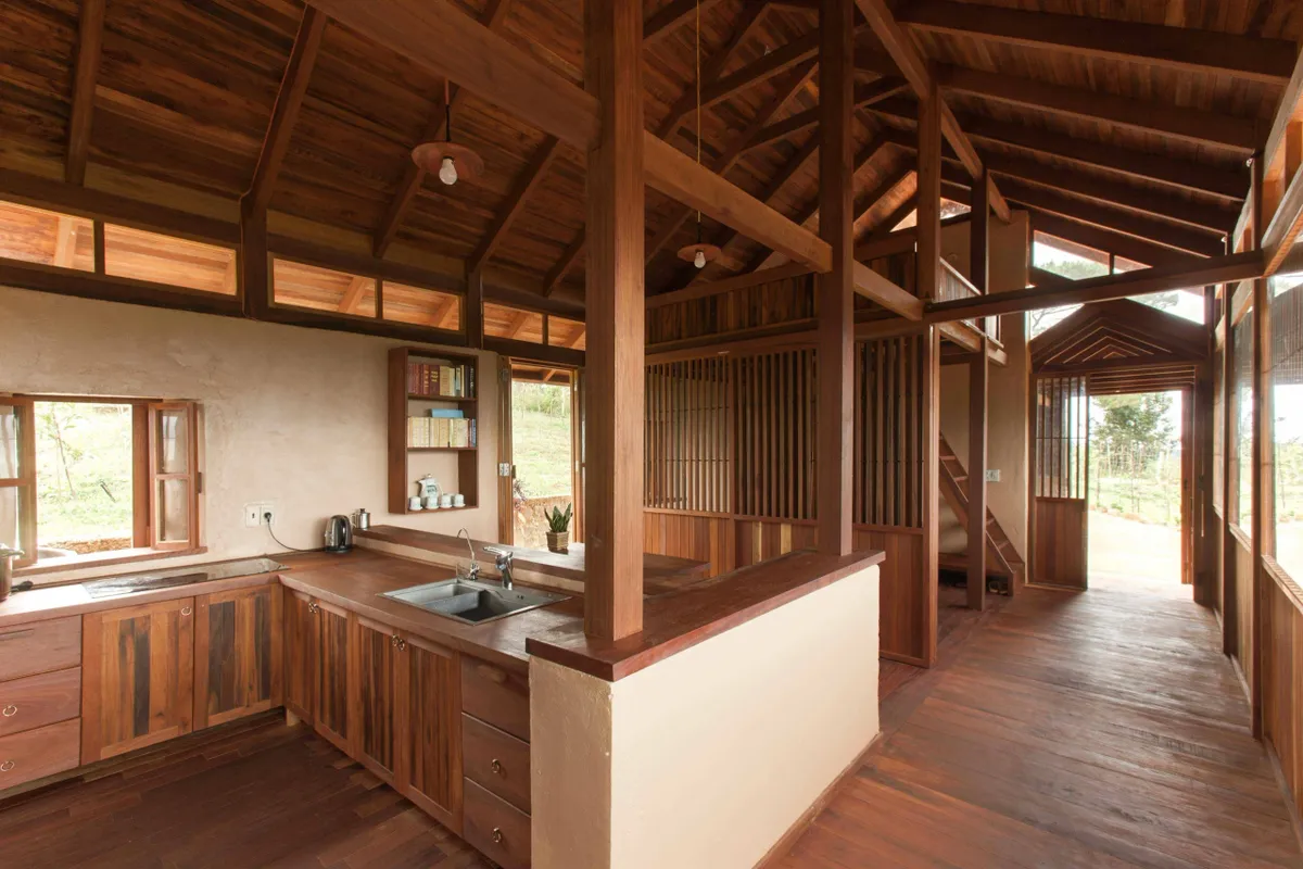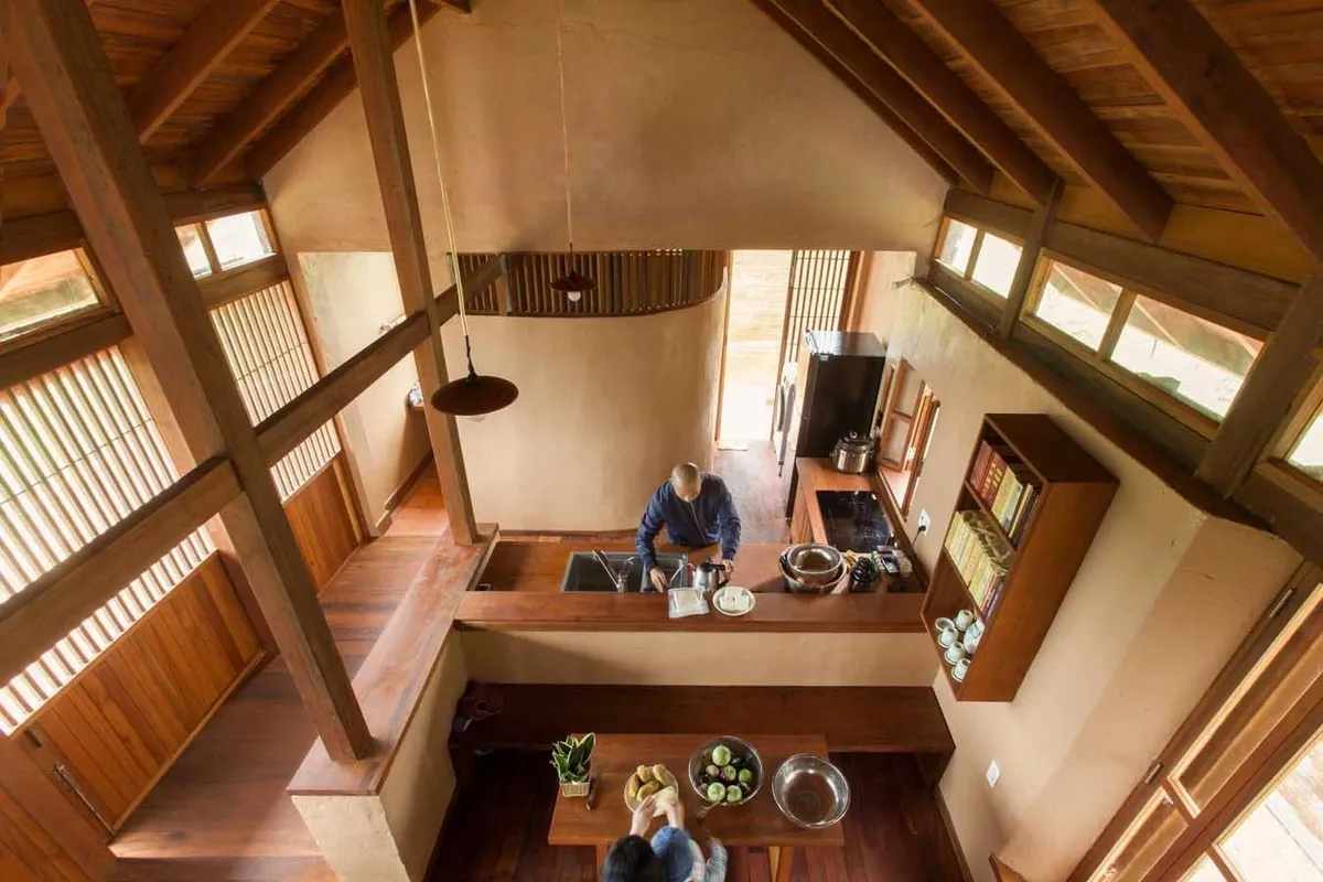 Bên trong, mọi chức năng sinh hoạt được tổ chức trong một không gian thống nhất. Hệ cột, vì kèo và mái gỗ để lộ tạo nên “bộ xương” hiển thị rõ ràng, giúp người ở cảm nhận mối quan hệ giữa cấu trúc và bao che.