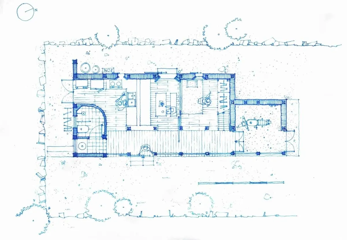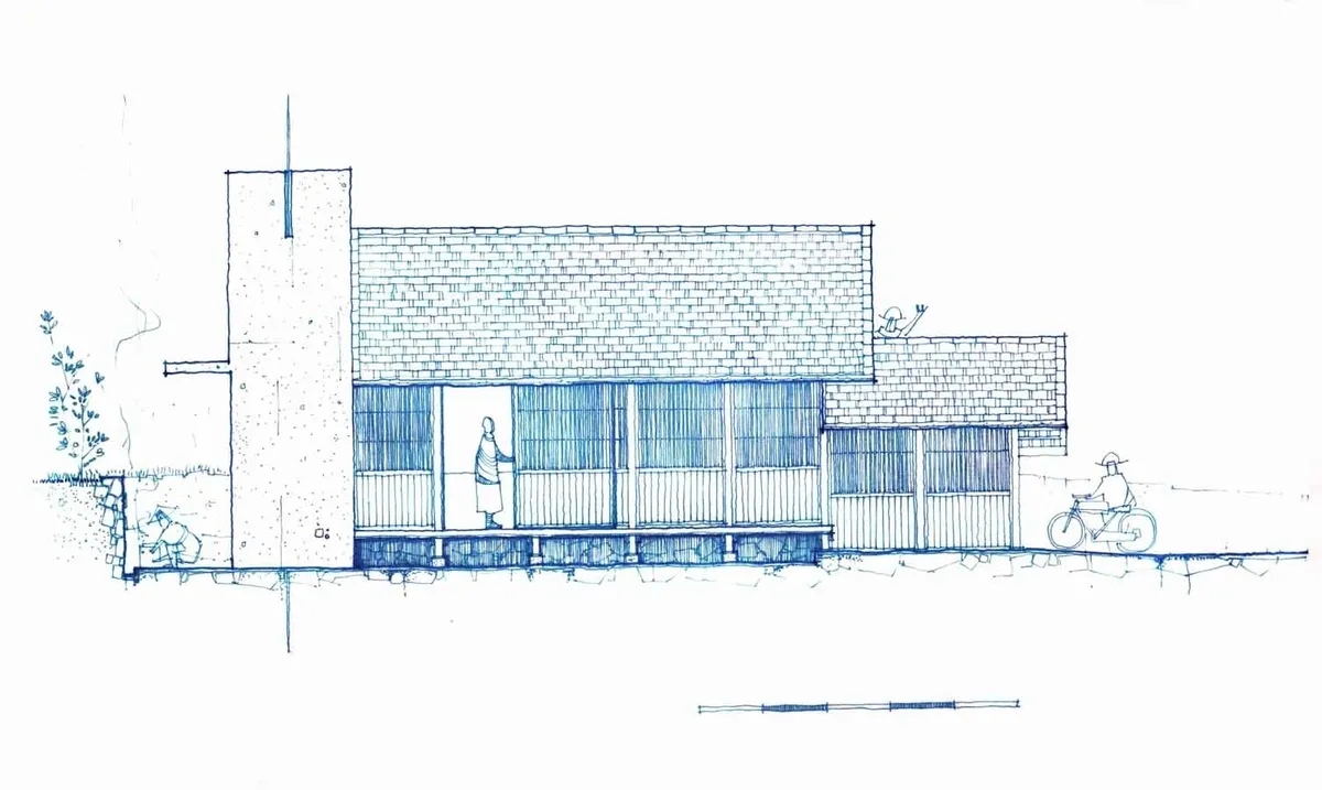 Khoảng hiên mở về phía Đông đóng vai trò như một không gian trung gian vừa là nơi nghỉ ngơi, vừa là “khung ảnh” nhìn xuống thung lũng. Hiên rộng kết hợp vật liệu gỗ giúp xóa nhòa ranh giới giữa bên trong và bên ngoài, đồng thời tạo một lớp đệm khí hậu quan trọng cho công trình. Ở phía Tây hướng đường đi và ánh nắng gắt tường dày được bố trí cùng các ô cửa nhỏ và dải cửa chớp cao. Tường đất nện vừa là lớp vật lý che nắng, vừa tạo độ ổn định nhiệt đáng kể cho ngôi nhà.