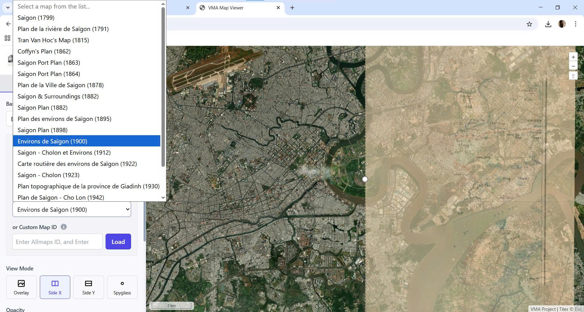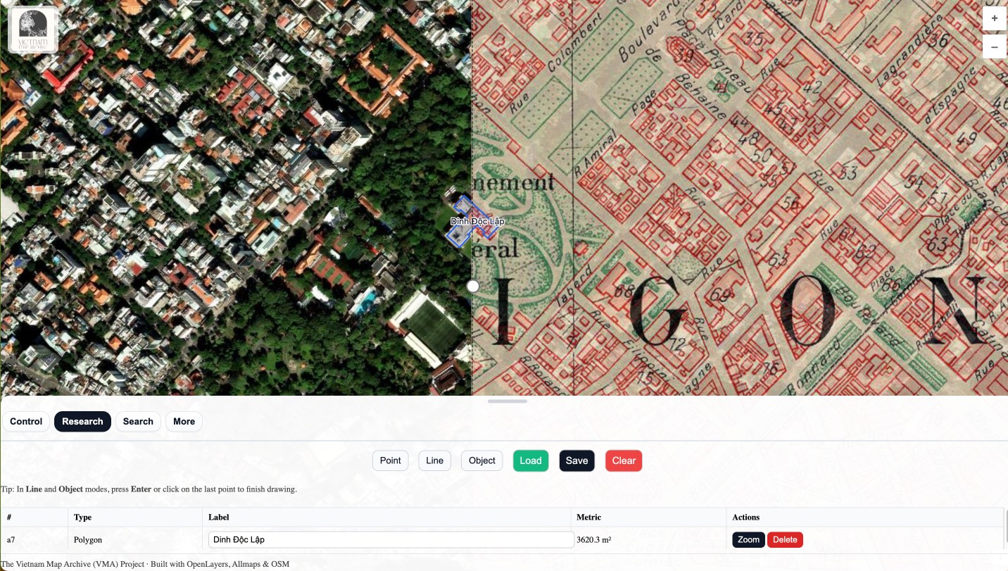 Được xây dựng theo định hướng mã nguồn mở (open-source), VMA cho phép người dùng xem, so sánh và phân tích bản đồ lịch sử Việt Nam theo nhiều cách trực quan — từ chồng lớp (overlay), song song (side-by-side) đến kính lúp (spyglass).